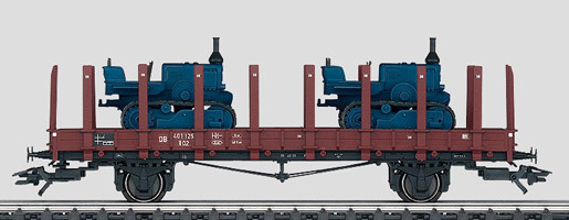 Modell: Abnehmbare Rungen. Fahrgestell mit Sprengwerk. Länge über Puffer 13,8 cm. Beladen mit 2 Raupenschlepper-Modellen. Fahrzeuge mit Fahrgestell und Aufbau aus Metall. Länge je